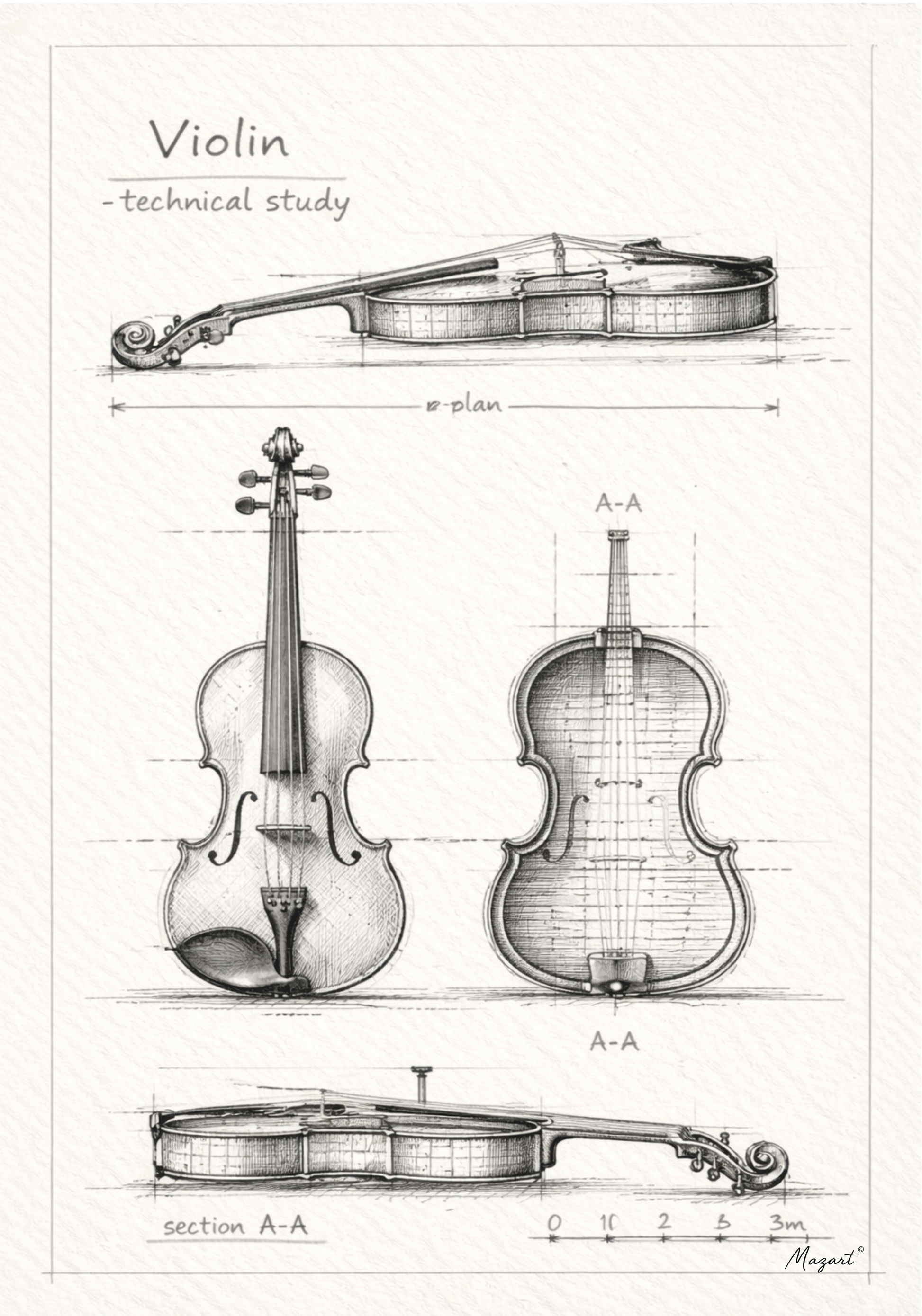 El çizimi estetiğiyle hazırlanan bu çalışma, kemanın dış formunu ve iç yapısını aynı yüzeyde birleştirir.